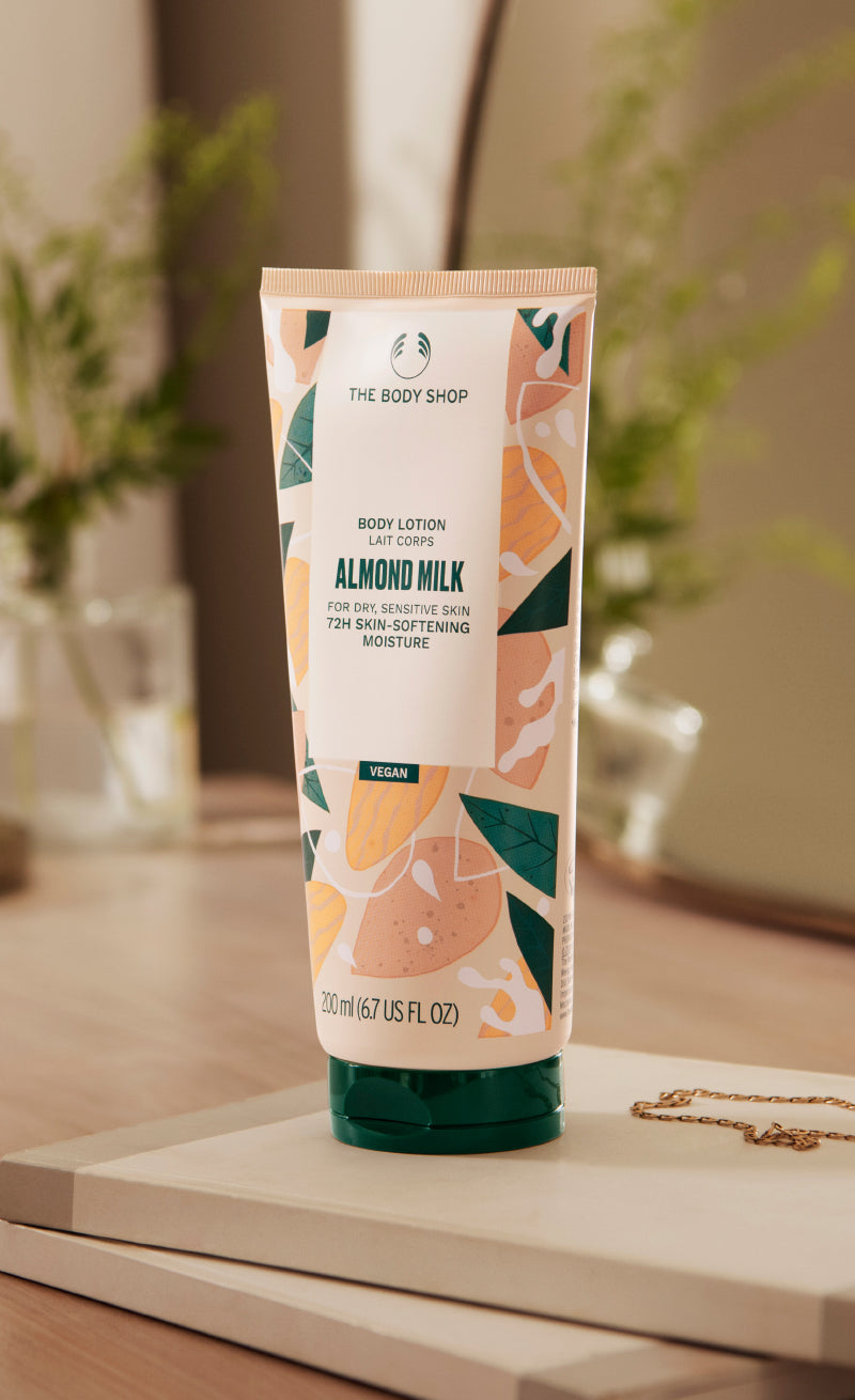 Unsere cremige Lotion ist jetzt vegan und besteht zu 93 % aus natürlichen Inhaltsstoffen, darunter Bio-Mandelmilch und -öl aus Spanien, die aus fairem Handel stammen. Sie zieht sofort in trockene, empfindliche Haut ein und hinterlässt ein sofort beruhigtes und glatteres Hautgefühl, ohne zu kleben oder zu fetten.