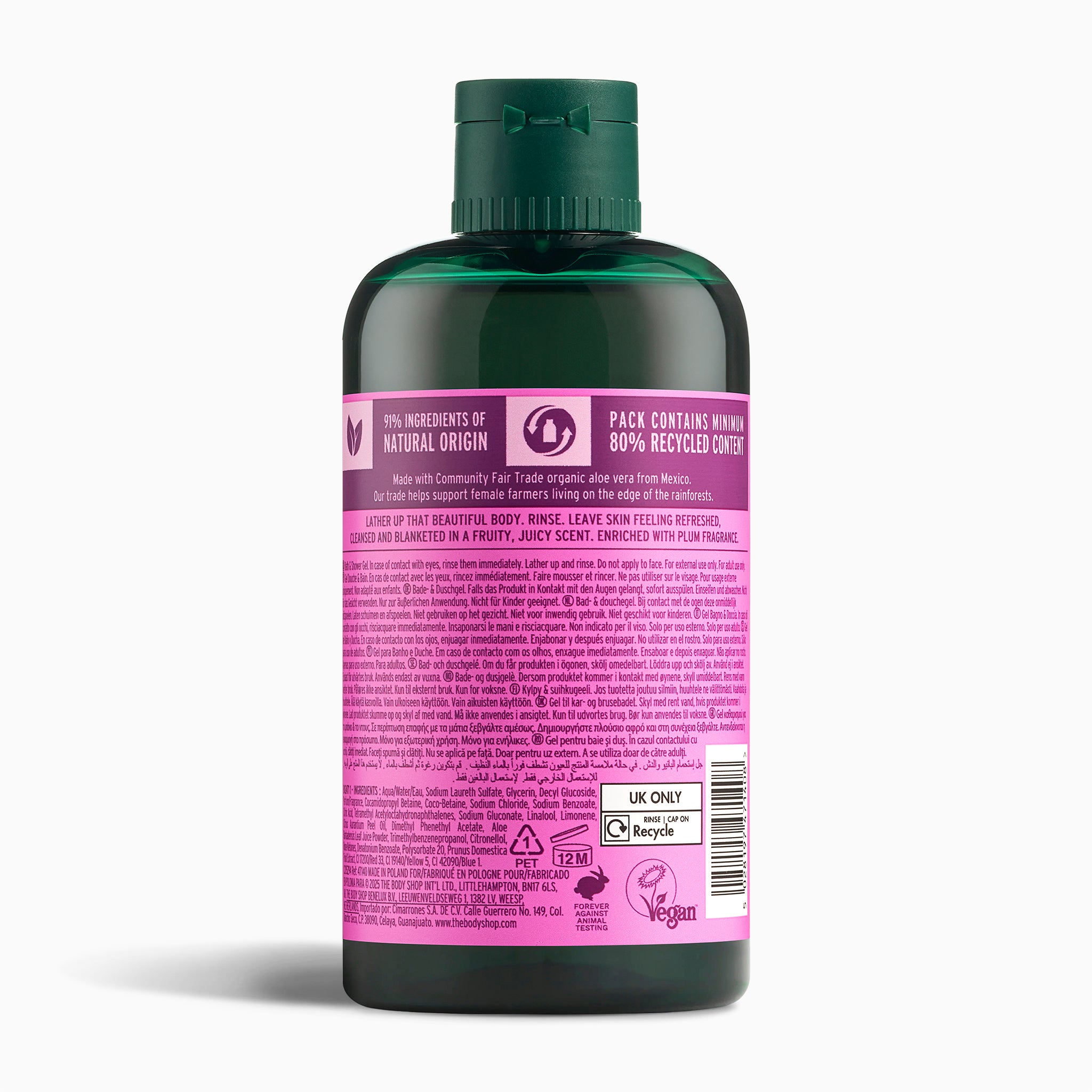 Diese saftige, fruchtig-blumige Formel reinigt sanft, ohne deiner Haut ihre natürliche Feuchtigkeit zu entziehen, und hinterlässt ein weiches, frisches und angenehmes Hautgefühl. Die spritzigen Noten von Pflaumensorbet, Himbeere und rosa Grapefruit, akzentuiert durch Aprikosenblüte und Magnolie, machen jedes Duschen zu einem festlichen Vergnügen.